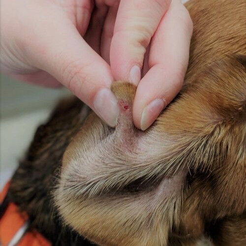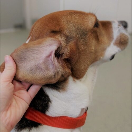 First, lift up the ear. It is easier to obtain a sample from the underside of the ear, where there is less hair to sift through.