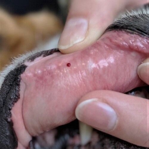 First, pull back your pet’s upper lip and wipe away saliva. Saliva can interfere with blood glucose results, so its important to make sure the lip is dry prior to obtaining your blood sample.