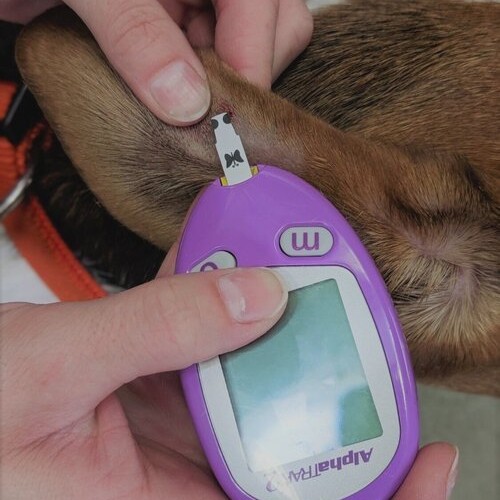 Libre Sensor: An alternative to blood glucose testing is a Freestyle Libre. The Freestyle Libre is a sensor that tests from the interstitial subcutaneous space. When the sensor is applied, a small catheter is inserted into your pet's skin, and is attached with skin safe adhesive. This sensor lasts for 14 days before it needs to be replaced, but has unlimited use during that time. To get a reading, all you need to do is turn the reader on and wave the Freestyle Libre reader over the sensor and a value will pop up.