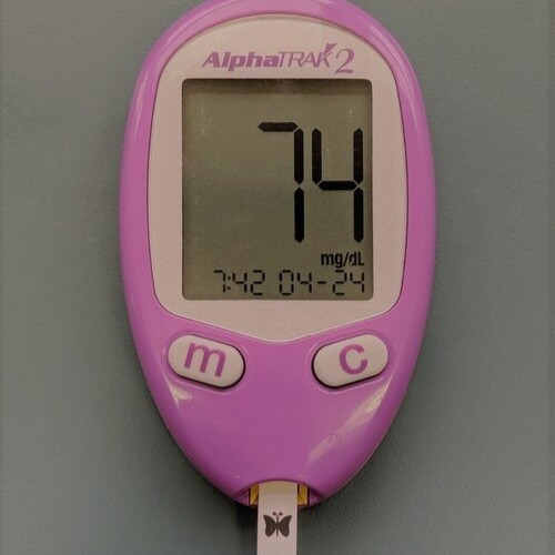 The most important part of at-home diabetic care is routine. This includes taking a blood glucose level, feeding a meal twice a day, and administering insulin at regular intervals, once in the morning, and once in the evening.